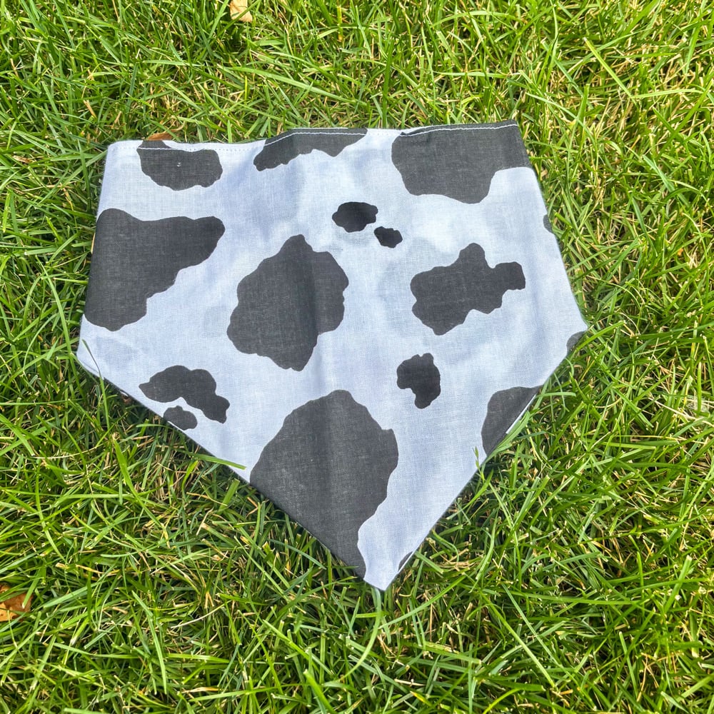 Disclaimer: Please note that not every bandanna will look the same, as they are created by fabric cut from a bolt. For this bandanna specifically, the black cow spots may not be exactly the same size/shape, or in the same location as in the product photos.